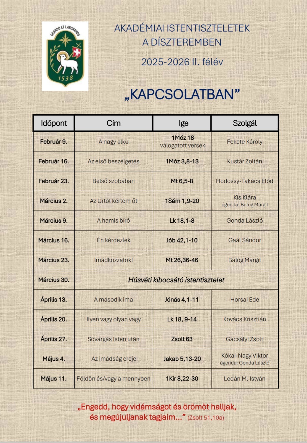 Itt láthatjátok a 2025/26. tanév II. félévének menetrendjét. Az Akadémiai Istentiszteletek minden hétfőn 18 órától lesznek megtartva a Díszteremben.
